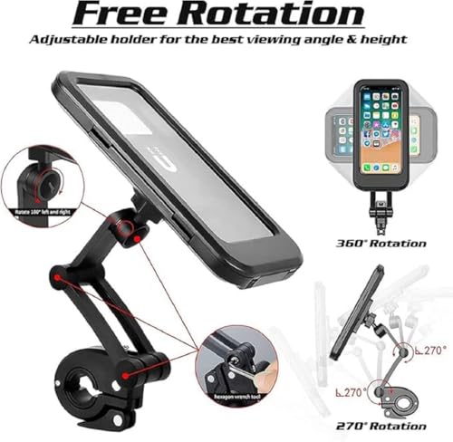 VERSATILE ROTATION: Features 360-degree rotatable phone mount with additional 270-degree adjustable arm for optimal viewing angles while riding
